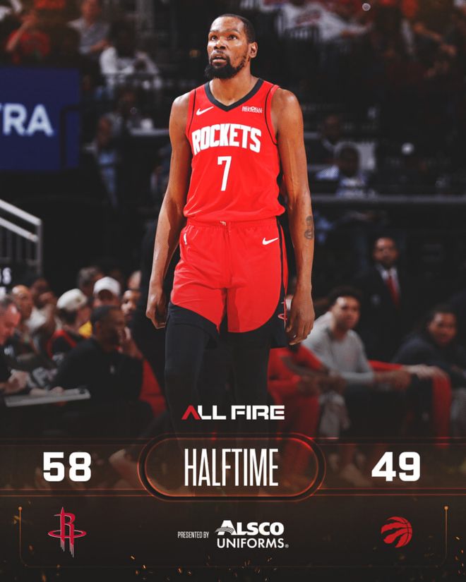 火箭隊(duì)的杜蘭特上半場(chǎng)得到22分和5個(gè)籃板,史密斯得到12分,湯普森得到10分;猛龍隊(duì)的巴雷特得到17分,巴恩斯得到10分。