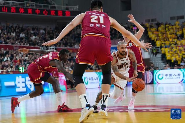 3月11日,山西汾酒隊球員賈明儒(左二)在比賽中運球突破。新華社記者 楊晨光 攝