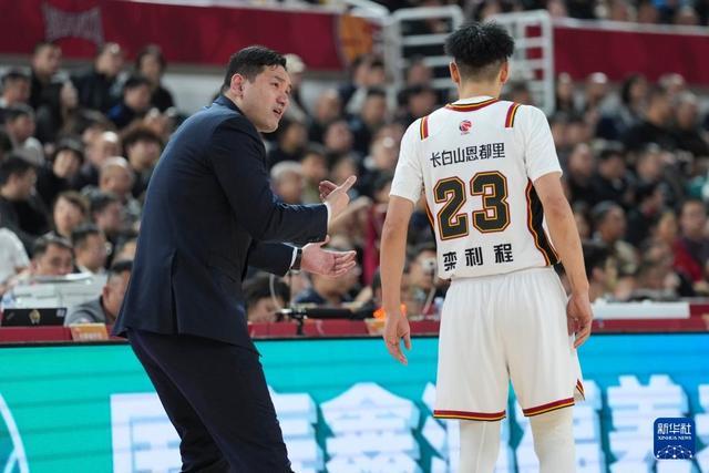 3月11日,吉林長白山恩都里隊主教練鐘誠(左)在場邊和球員欒利程溝通。新華社記者 楊晨光 攝